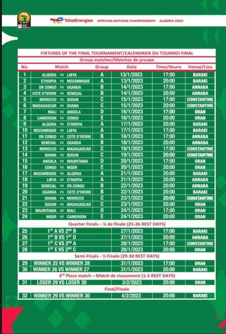 En effet, le tournoi dédié aux joueurs évoluant dans les championnats locaux va se disputer en Algérie du 13 janvier au 4 février 2023. Selon l’instance du football africain, les matchs de groupe sont prévus entre le 13 janvier au 24 du même mois, alors que les quarts de finale auront lieu le 27 et 28 janvier également. Les demi-finales elles, se joueront le 31 janvier. La troisième place et la finale sont programmées respectivement le 03 et 04 février.