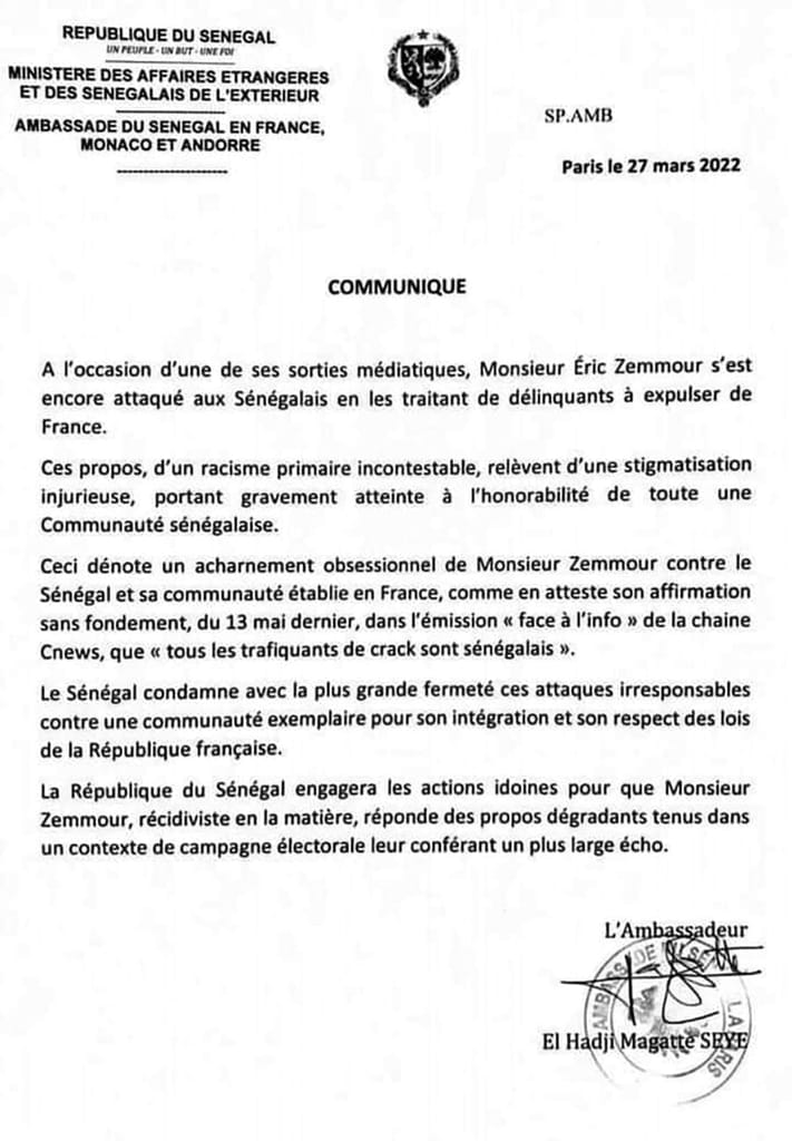 « À l’occasion d’une de ses sorties médiatiques, Monsieur Éric Zemmour s’est encore attaqué aux Sénégalais en traitant les délinquants à expulser de France. Ces propos, d’un racisme primaire incontestable, illustré d’une stigmatisation à l’honorabilité de la Communauté sénégalaise », écrit le diplomate sénégalais en poste à Paris.