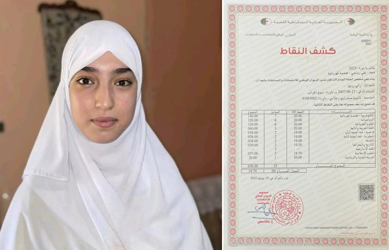 À dix-huit ans, Raounak Zani est devenue un symbole de réussite. Cette brillante lycéenne algérienne a atteint la première place au baccalauréat national 2025, un accomplissement qui lui a valu une reconnaissance au-delà des frontières.